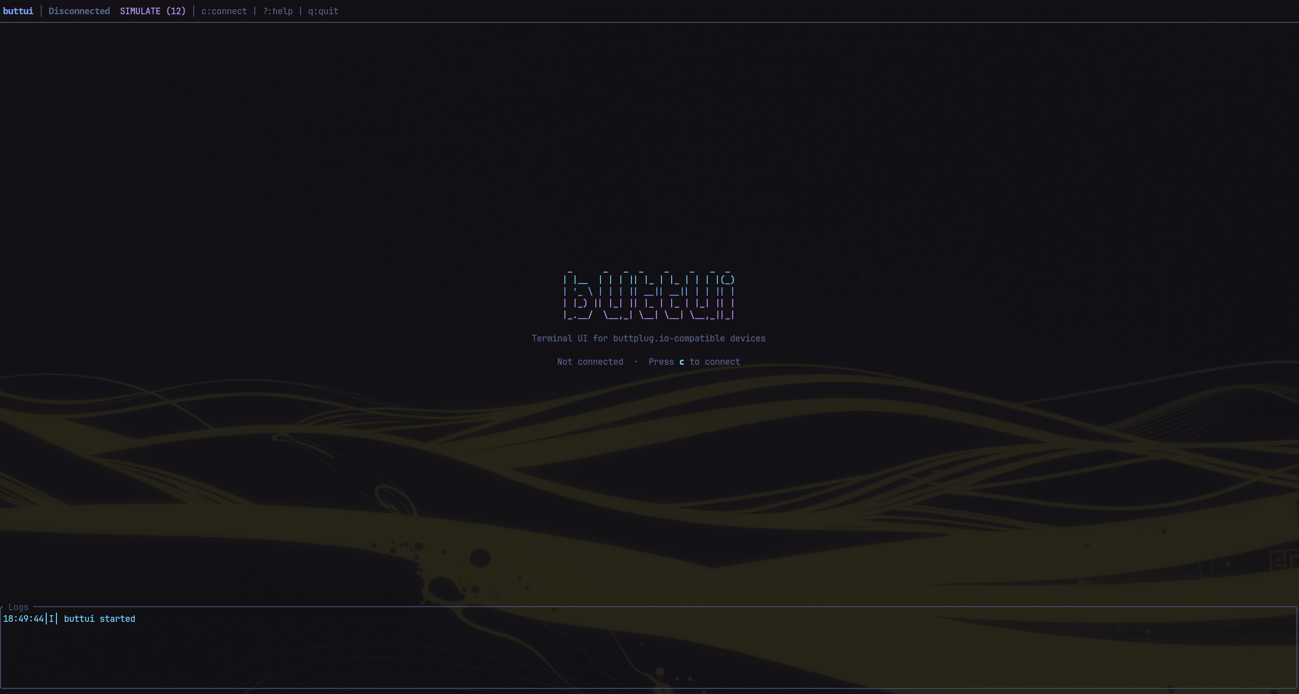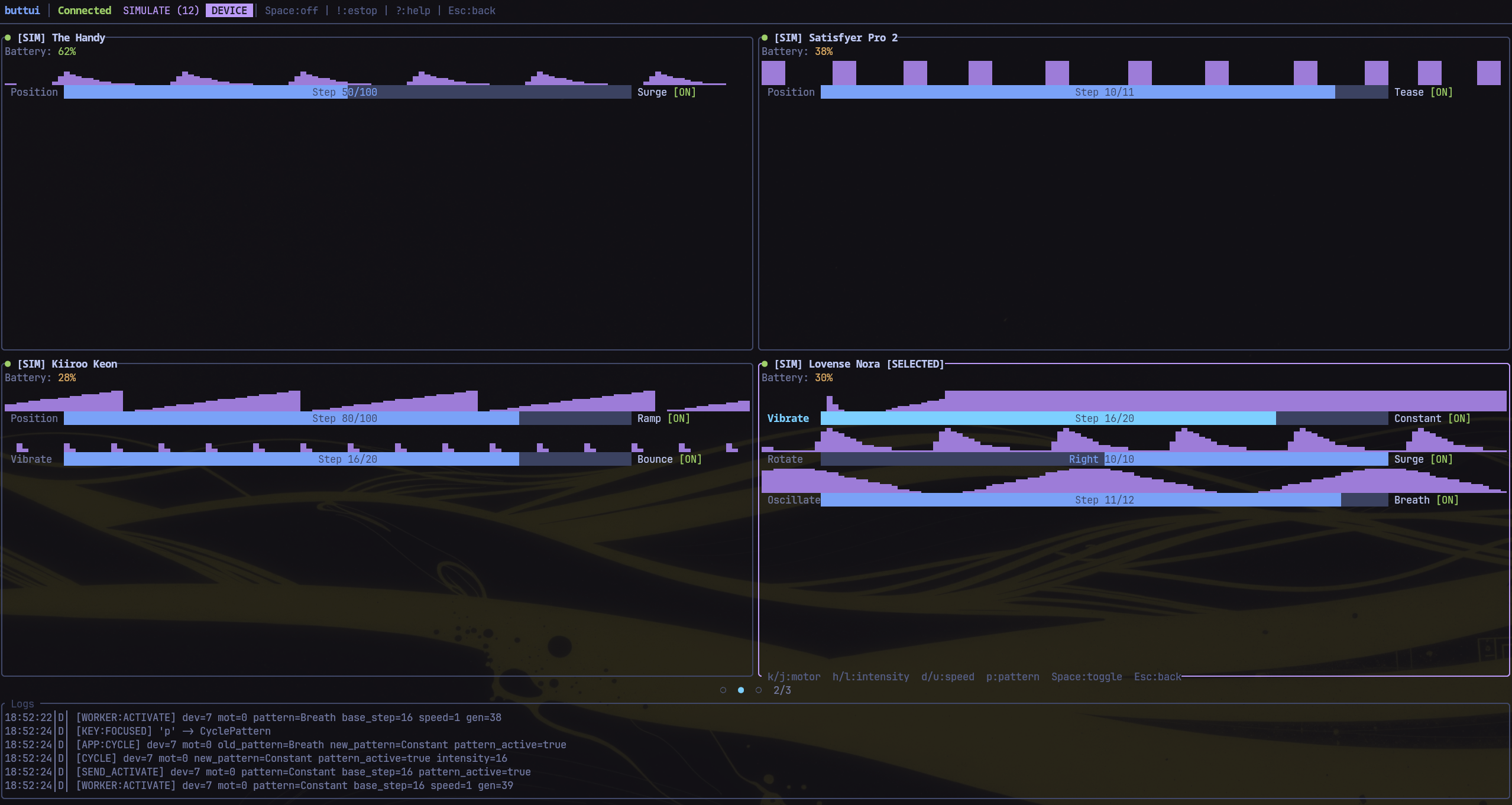 buttui is a Rust terminal user interface that talks the Buttplug protocol, so you can control Buttplug.io-compatible devices with your keyboard.